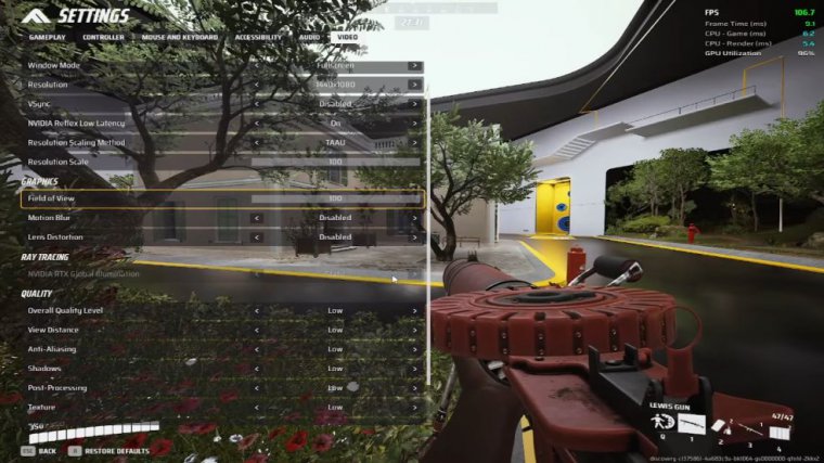 T au, the other two will make it a little bit blurry, is what I've seen, and it just doesn't give you the best FPS draw, so I keep this on and keep your resolution scale up at 100 or else the game will look gross. Your frame of view can now be changed; you can lower it down, and as you can see, the FPS does increase, but then you have nothing inside of your screen.