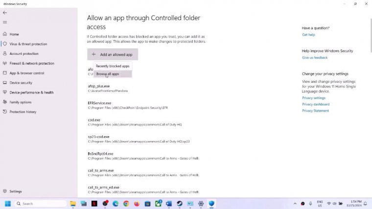 Click on Allow an App Through to Control Folder Access. Click yes to allow. Now click on add an allowed app. Now click on Browse All Apps. Now go to the game installation folder. If the game is installed on a C drive, open the C drive program files for x86. Open the Steam folder, then open the Steam apps folder, and then open the common folder.