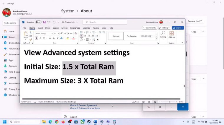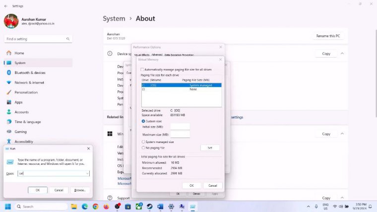 Uncheck this box and select the drive where the game is installed, so select the drive, and then once you select the right drive, now put a check on custom size, and for the initial size, it's 1.5 into total RAM, so you can check the total RAM in Windows settings. You can go to system and then go to about, and the total RAM in my case is 16 GB, so you can calculate.