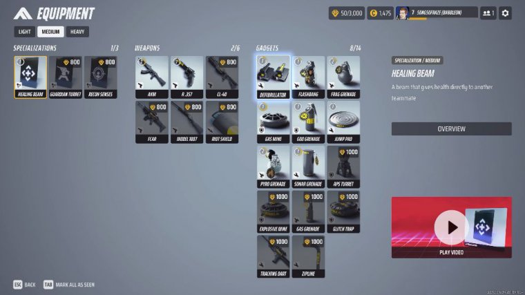 So those are my top three picks one for specialization one for weapon one for Gadget when it comes to the light class and now we're going to pretty much swap over to the medium class and this one's going to be very simple the reason why is because the medium class pretty much has most of the stuff that you kind of need already unlocked for itself once you pretty much start the game once you've unlocked the mate medium class which is the first class that you do get inside this game, everything that you pretty much have here is pretty good the healing beam is great it's perfect for being able to keep your teammates alive it's a great way of being able to like just in the middle of a firefight be able to keep someone going just be able to kick start that health regen the akm is definitely one of the better guns for the medium class the r357.