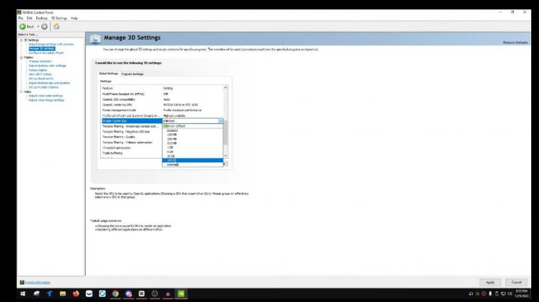 While the game is open, you might want to consider setting this to ultra, but that's not the case for me, so I'm going to leave it on the open GL rendering GPU. Set this to your GPU, power management mode, and preference for maximum performance. Preferred refresh rate highest available Shader cach size Set this to unlimited.